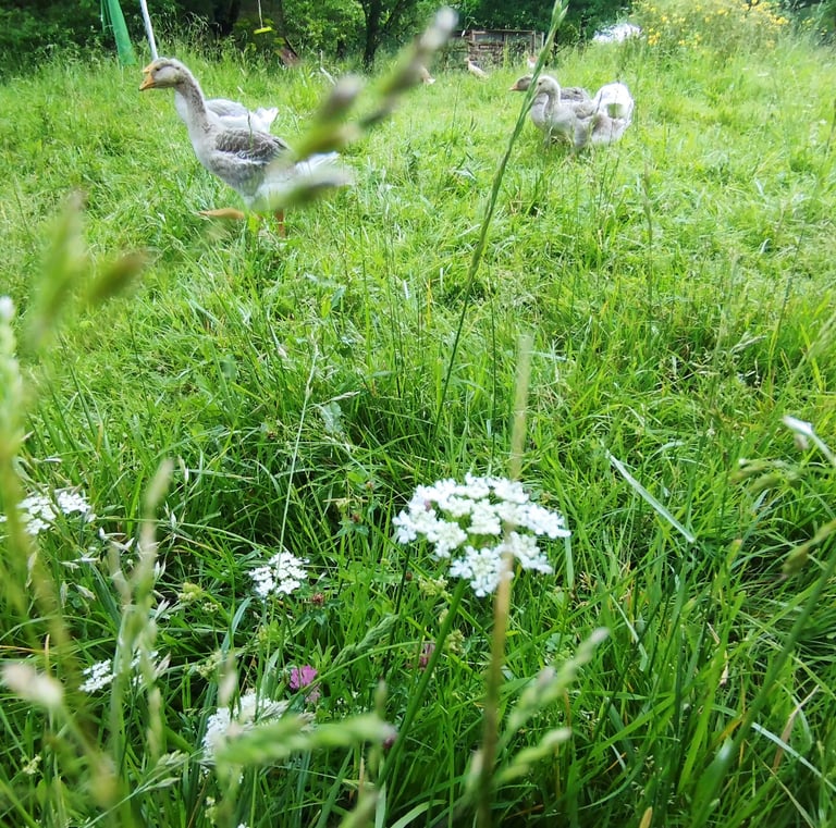 Après les six premières semaines de leur vie, nos oies sont nourries exclusivement à l'herbe. Elles partages la pature avec les moutons. Cette alimentation naturelle leur confère des teneurs organoleptiques meilleures pour la santé.